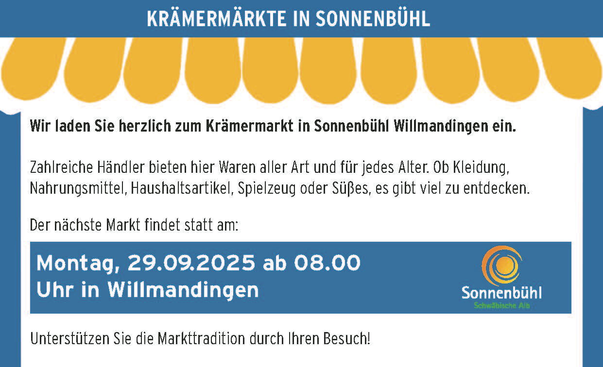 Wir laden Sie herzlich zum Krämermarkt in Sonnenbühl Willmandingen ein.